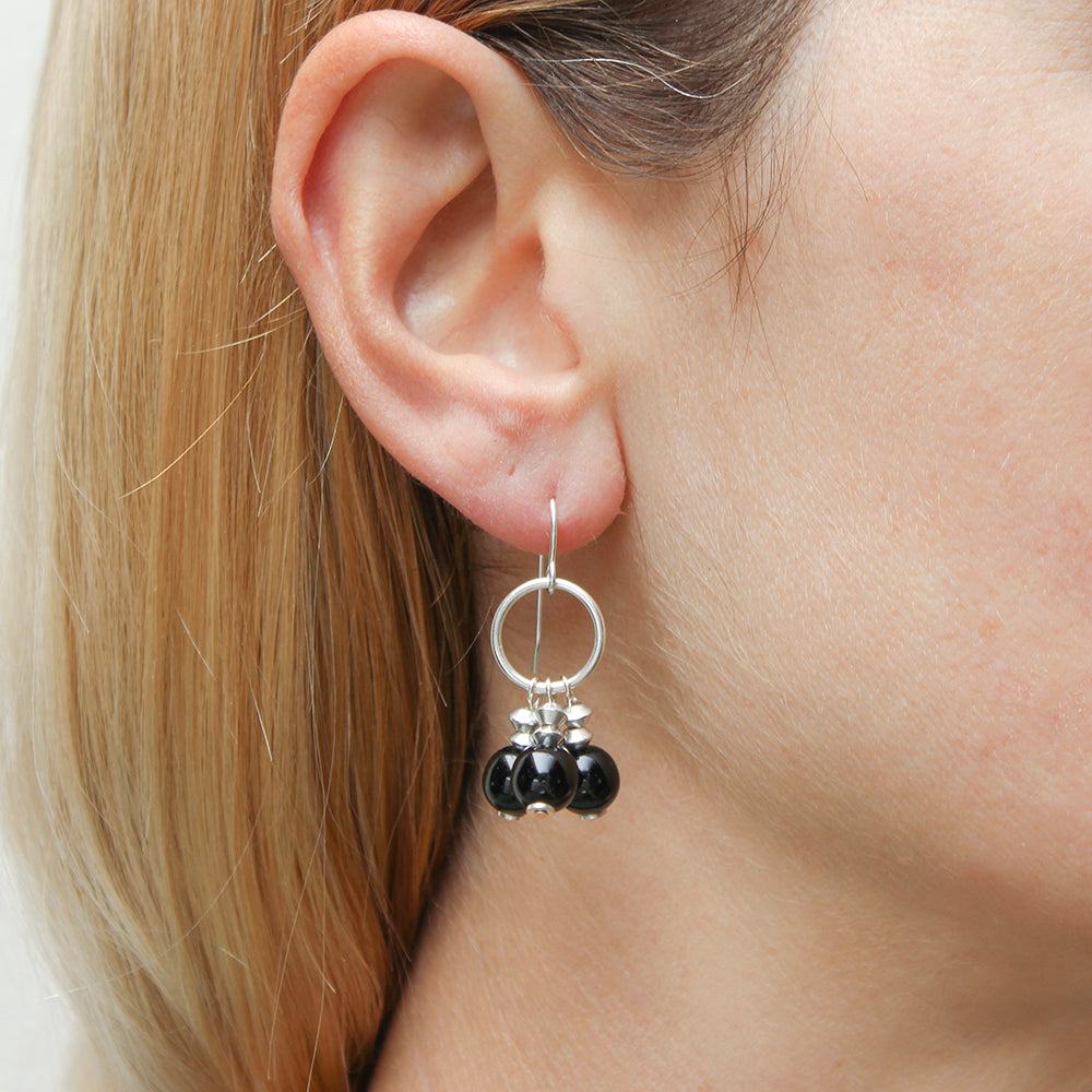 A silver ring with three strands of silver saucer and black beads. Wire earring.