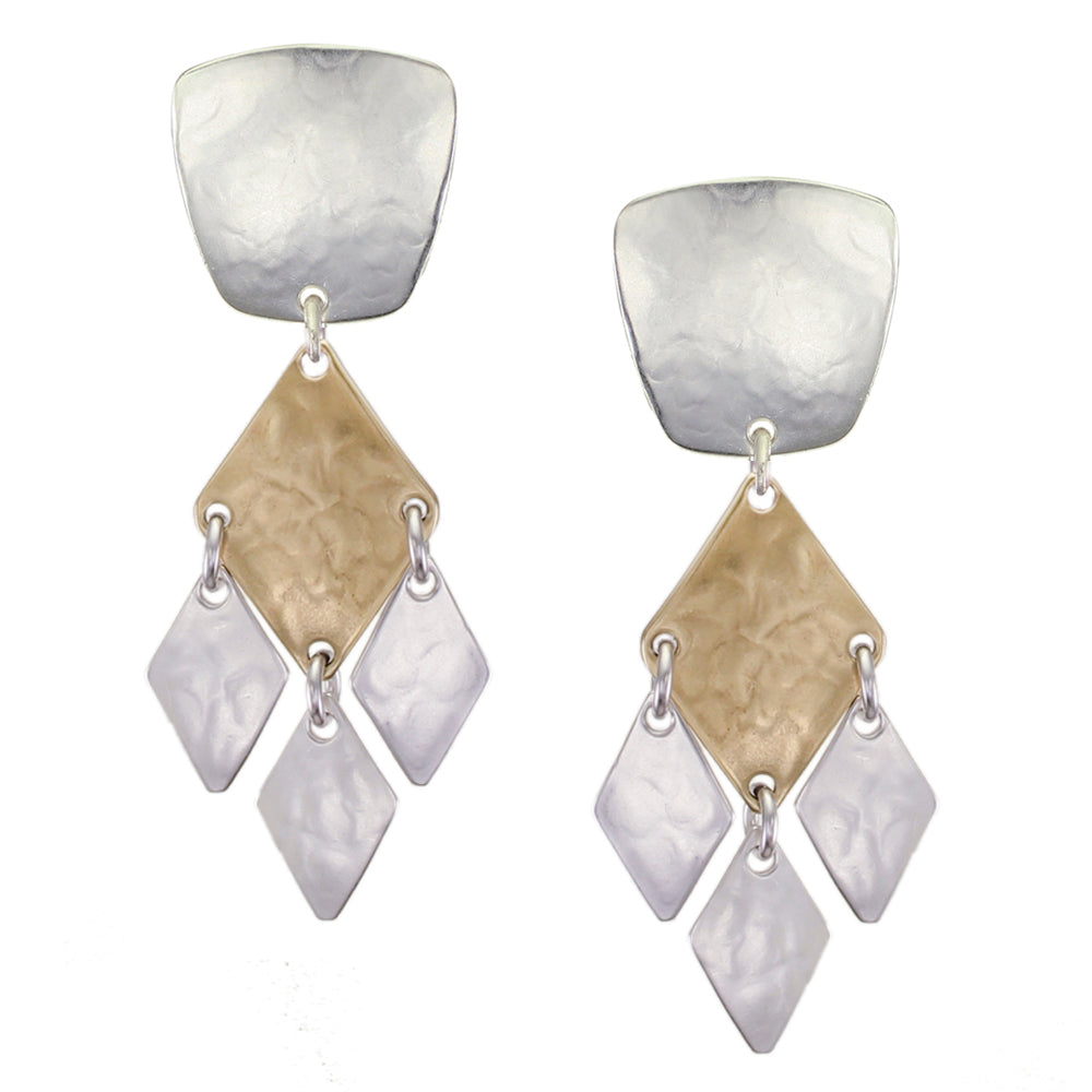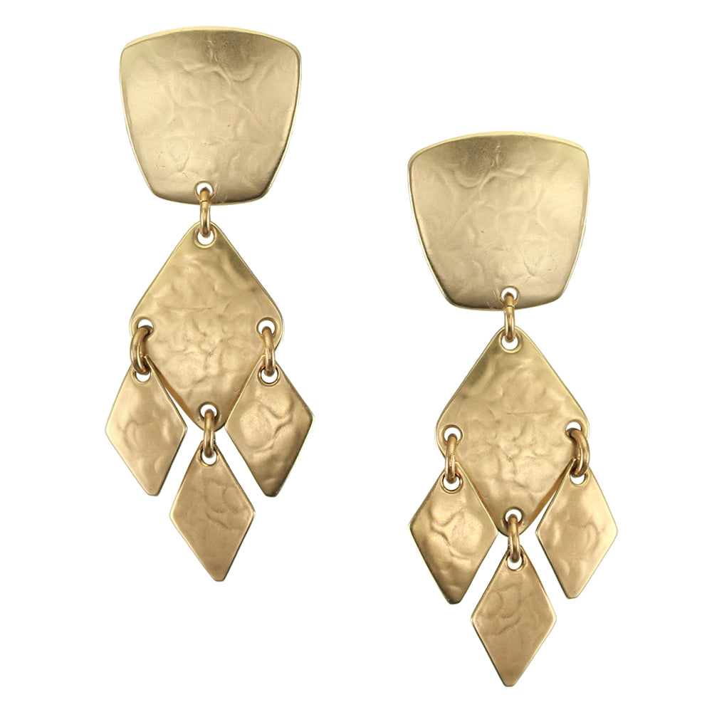 A tapered square linked with a diamond with three smaller diamonds. Clip or post earring.