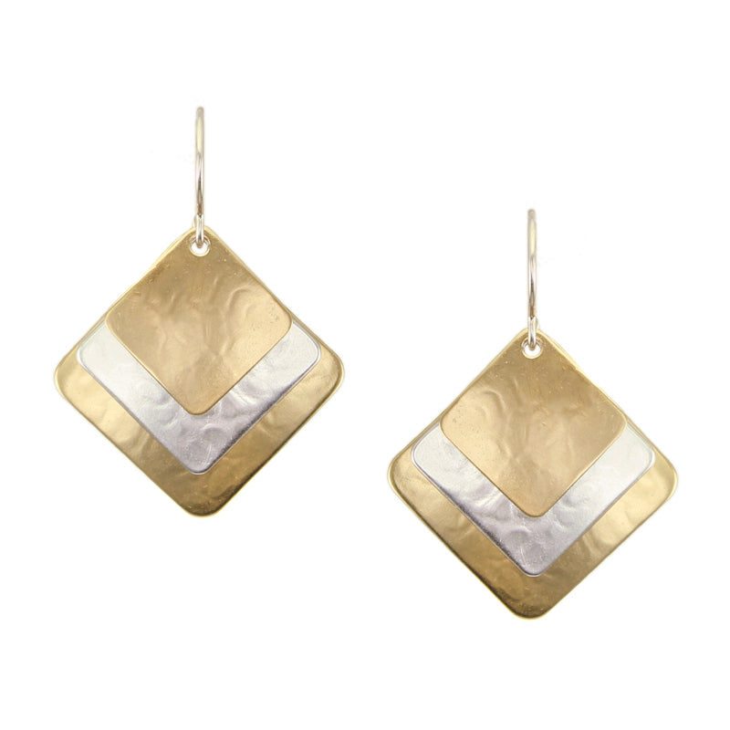 Three hammered and layered rounded squares in brass and silver. Wire earring.