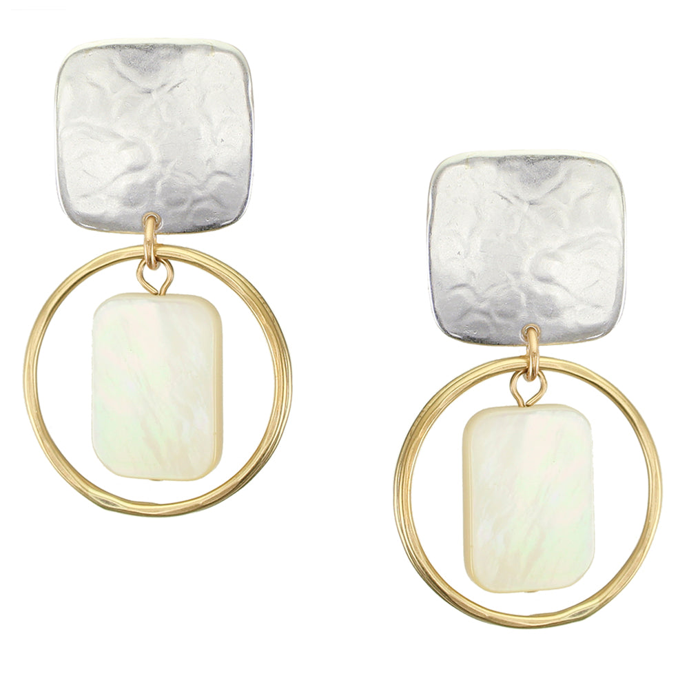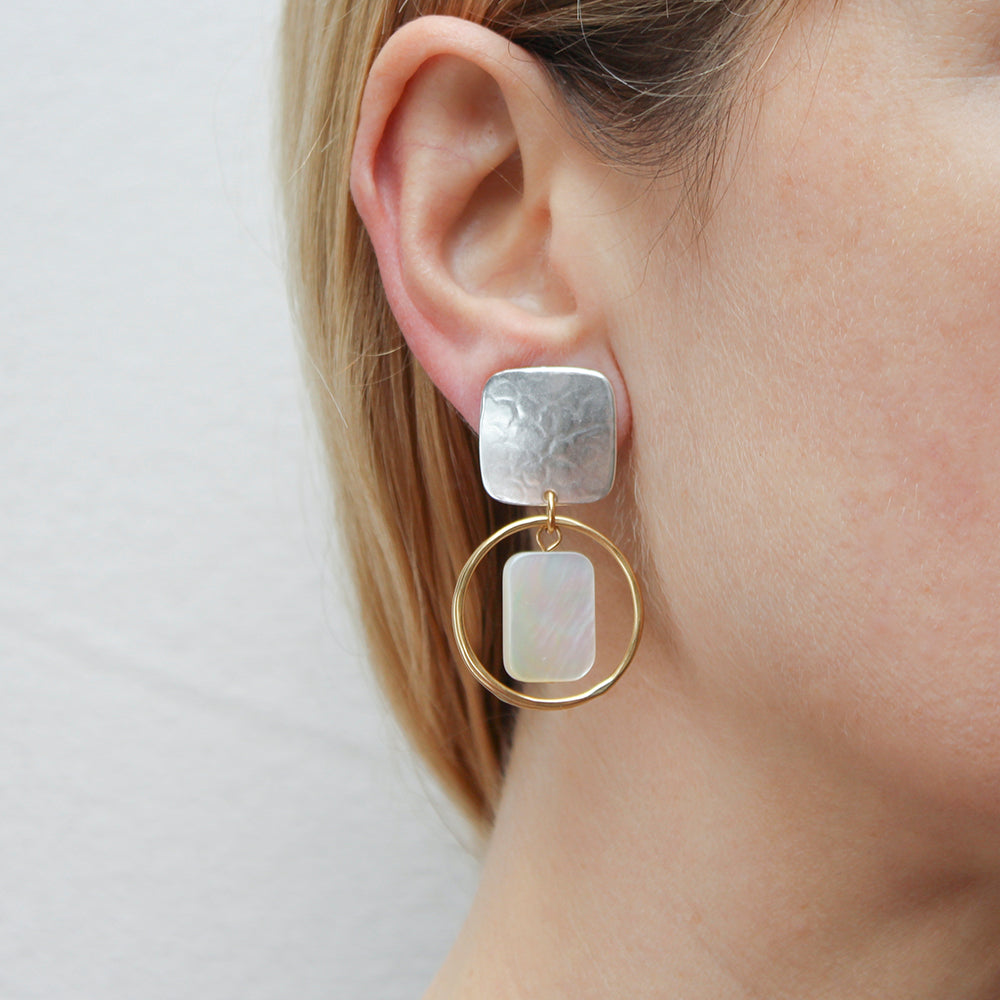 A silver rounded square linked with two thin hammered brass rings with a rounded rectangular Mother of Pearl bead hanging in the center. Post or Clip earring.