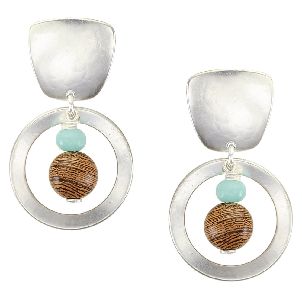 A silver tapered square linked with a concave wide ring with a dark wood and light blue aventurine bead hanging in the center. Post or Clip earring.
