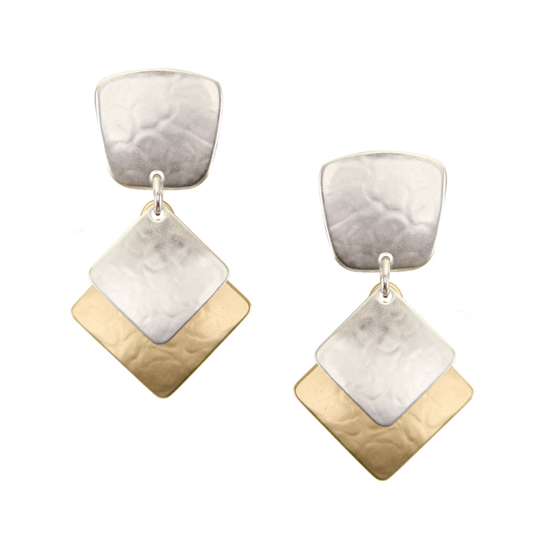 A tapered silver top linked with two layered squares in brass and silver. Post or Clip earring.