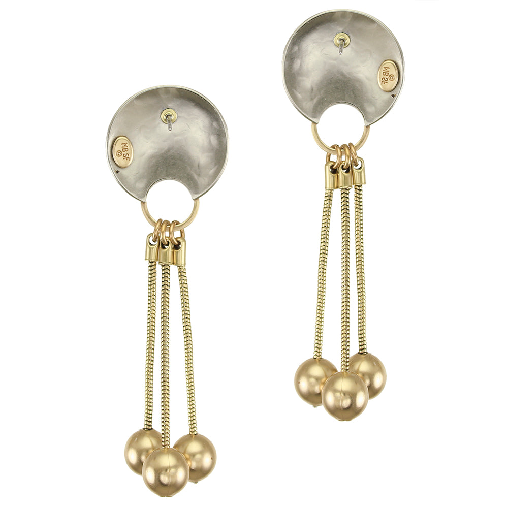 A hammered nickel top linked with a brass ring and three lengths of snake chain with brass balls at the end. This is a new reproduction of a vintage style. Clip or Post Earring. The top is nickel - please avoid if you have a nickel allergy.