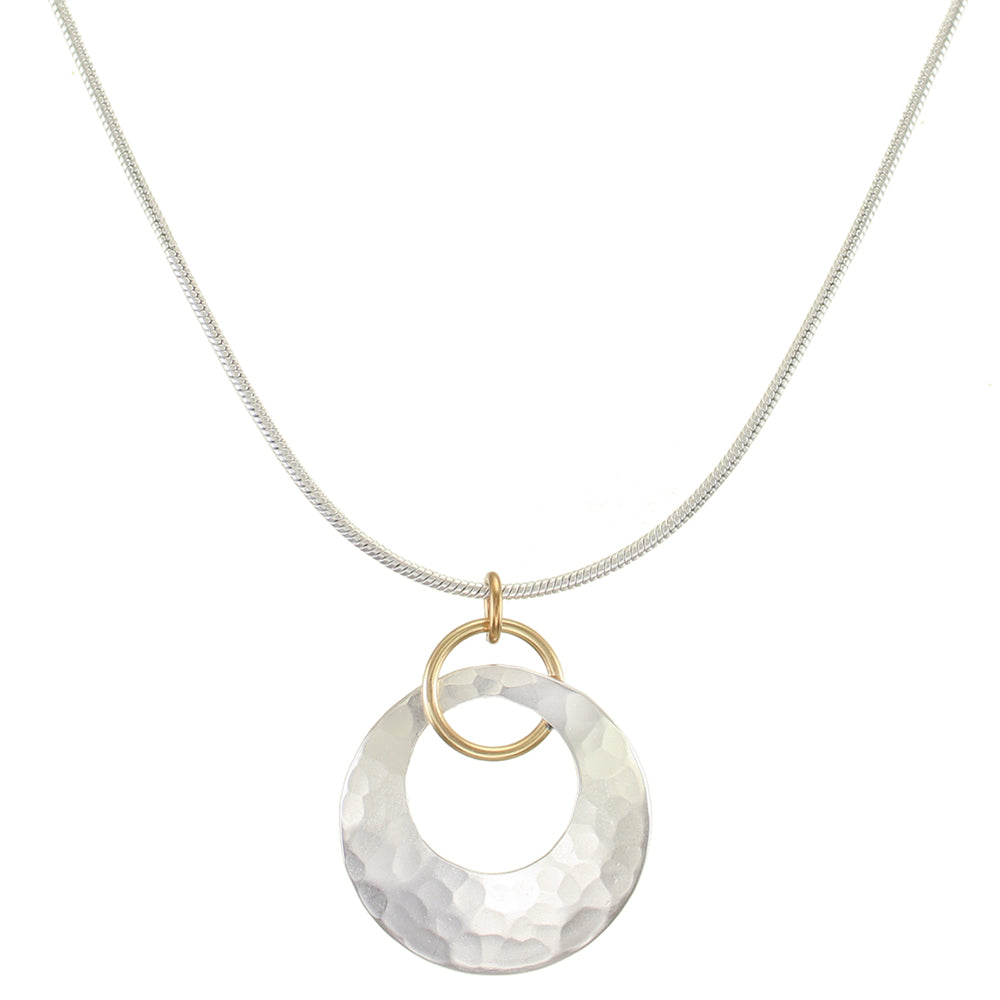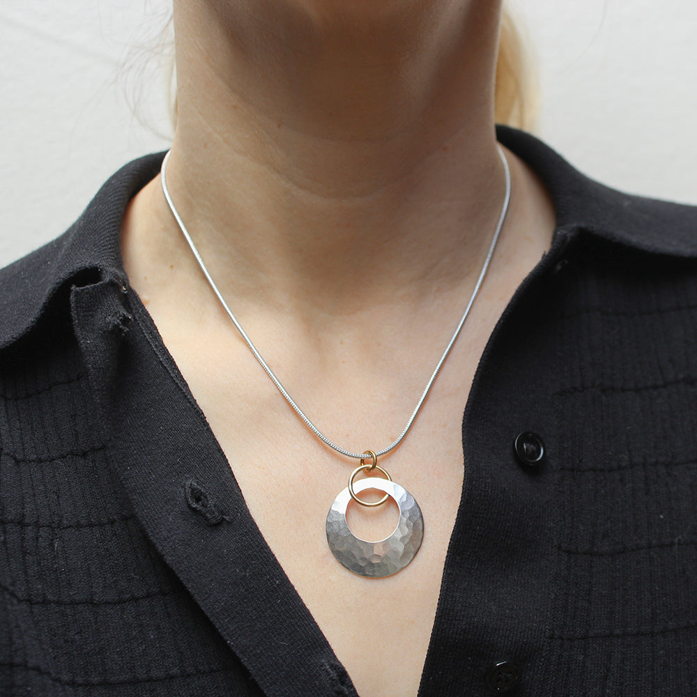 A brass ring interlocking a silver cutout disc with faceted hammering - on silver snake chain.