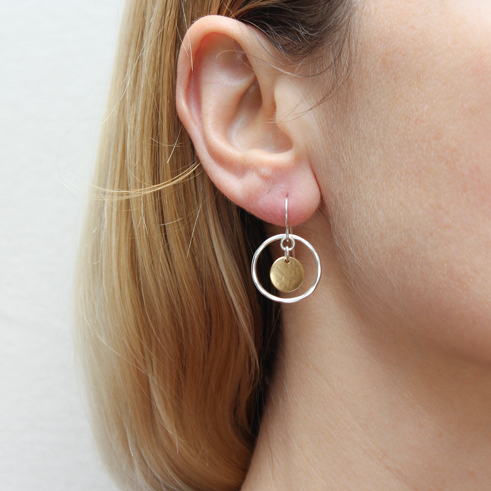 A silver hammered ring with a brass disc hanging in the center. Wire earring.