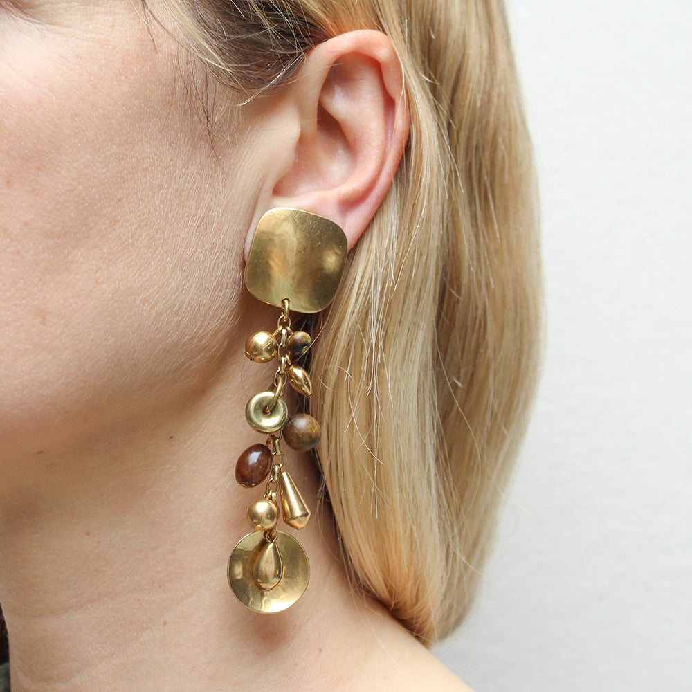A new brass top linked with vintage Marjorie Baer shoulder duster drop of beads in brass and wood. Clip Earring.