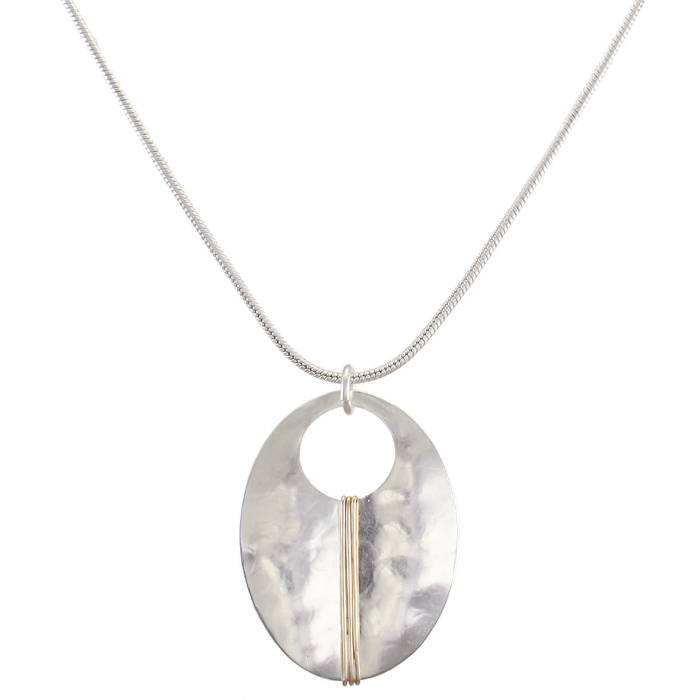 A silver cutout oval with a slight fold and brass wire wrapping in the center - on silver snake chain.